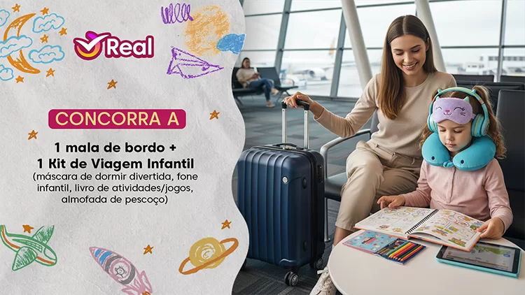Neste mês, os clientes da Real concorrem a 1 mala de bordo e 1 kit de viagem infantil. Veja como participar: